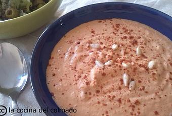 Ensalada de hojas verdes aliñadas con aceite, sal del Himalaya o de Guérande, hierbas secas y limónPREPARACIÓNPonemos en el vaso de la batidora los piñones escurridos, los tomates, el pimiento, el diente de ajo pelado, la cebolleta y el vinagre. Batimos bien. Poco a poco, sin dejar de batir, vamos añadiendo el aceite hasta que emulsione bien. Servimos frío, decorado con unos piñones y pimentón.PREPARACIÓN CON THERMOMIXPonemos en el vaso los piñones escurridos, los tomates (con piel), el pimiento, el diente de ajo pelado, la cebolleta y el vinagre. Trituramos 1 min/vel. progresiva 5-10.Separamos un poquito el tapón (sin llegar a quitarlo del todo) y vamos añadiendo muy poco a poco el aceite, triturando vel.3 (si lo ponemos más deprisa, nos salpica). Cuando hayamos añadido todo el aceite, ponemos de nuevo el tapón y trituramos 1 min. vel. 8-9, hasta que lo veamos bien emulsionado. Servimos frío, decorado con unos piñones y pimentón.