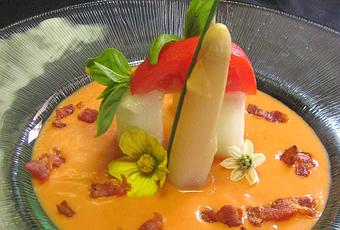 4º " Corté las tiras de panceta o beicon, y las pasé por la sartén, hasta que quedaron crujientes.5º " Montamos el plato. Colocamos dos puntas de espárrago y dos cilindros de pepino que habremos hecho con un vaciador de manzanas, un trocito de tomate encima para aguantarlo, echamos el Salmorejo y añadimos la tiras de panceta por encima, un par de flores y un cebollino y listos para servir, espero que os guste..