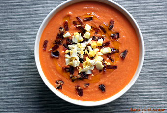 Lo primero que debemos hacer es pelar los tomates como os enseñamos en el truco. Una vez que los tenemos todos sin la piel, los trituramos conjuntamente con el ajo en una batidora y lo metemos en un recipiente amplio. Añadimos el pan previamente rayado, el aceite, sal y un chorreoncito de vinagre. Con ayuda de la batidora batimos todo muy bien. Tiene que quedar una consistencia de crema espesa. Lo probamos y corregimos de sal y vinagre. El salmorejo se tiene que servir bien frío. Yo lo meto una media hora antes de servir en el congelador. No os olvidéis de removerlo bien antes de servir. Para presentar lo servís en un plato hondo y podéis picar jamón, huevo cocido y un poco de aceite de oliva por encima. Ya me contaréis que tal os queda, para mi gusto, espectacular!
