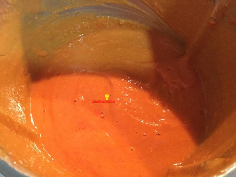 Añadimos el pan y el vinagre, si le ponemos, y trituramos 30 Seg, Vel. 5 y a continuación bate 2 Min, Vel. 10. El tiempo dependerá de la calidad de los tomates.