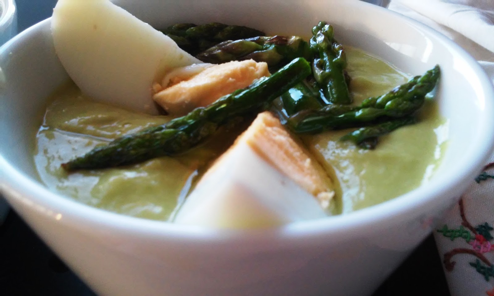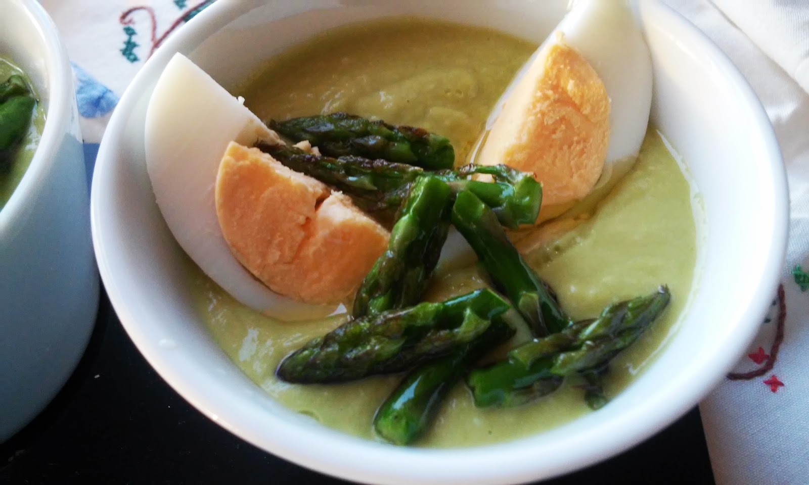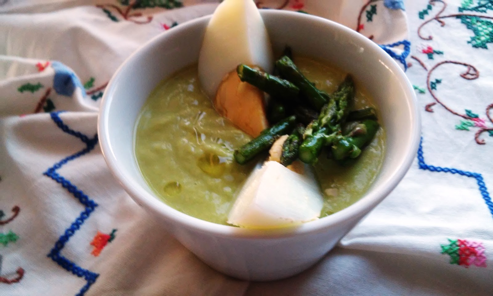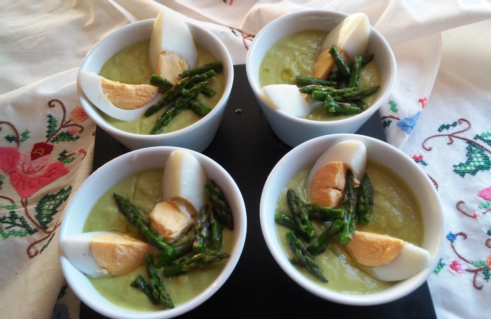 Pon a hervir agua en una cacerola y cuece los espárragos trigueros, reservando las puntas. Previamente habremos quitado los cabos duros. Cuando estén tiernos pásalos por agua muy fría para que no pierdan su verdor y reserva el caldo de la cocción.En el vaso de la Thermomix pon el pan , los espárragos blancos escurridos, los trigueros , un huevo duro, 1/2 vaso ( de los de agua )con el caldo reservado, 1 diente de ajo, vinagre y sal. Programa velocidad progresiva 5-10, durante 10 segundos.Terminado este tiempo, ve echando el aceite poco a poco en la tapadera y sin quitar el cubilete , para que se vaya ligando bien, programando velocidad 4, 2 minutos.Las puntas de espárragos reservadas las saltearemos en un sartén manchada con una poco de aceite en el fondo.Sirve bien frío adornado con las puntas de los espárragos trigueros , los huevos duros cortados en cuartos y un chorrito de aceite de oliva.