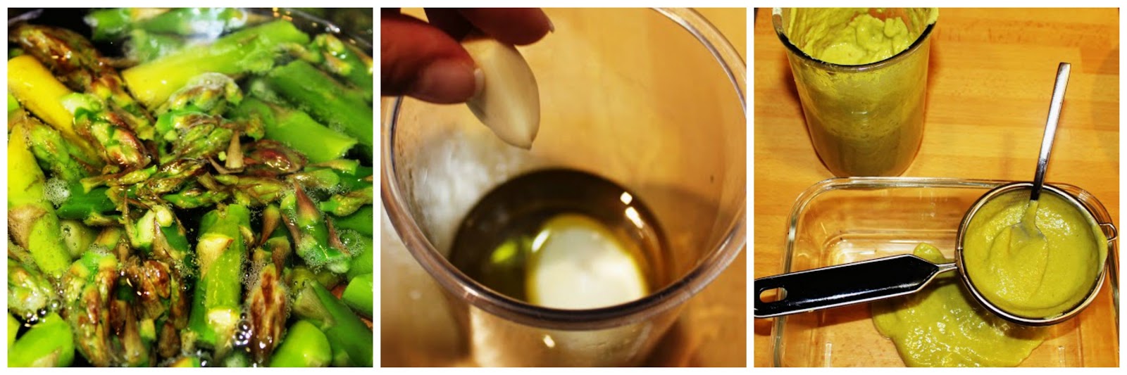 3.- En la batidora ponemos el huevo (cocido), el aceite, el ajo, sal y vinagre al gusto. Emulsionamos y añadimos los trigueros. Batimos bien. Si la mezcla queda muy espesa añadimos algo del líquido de cocer los espárragos.