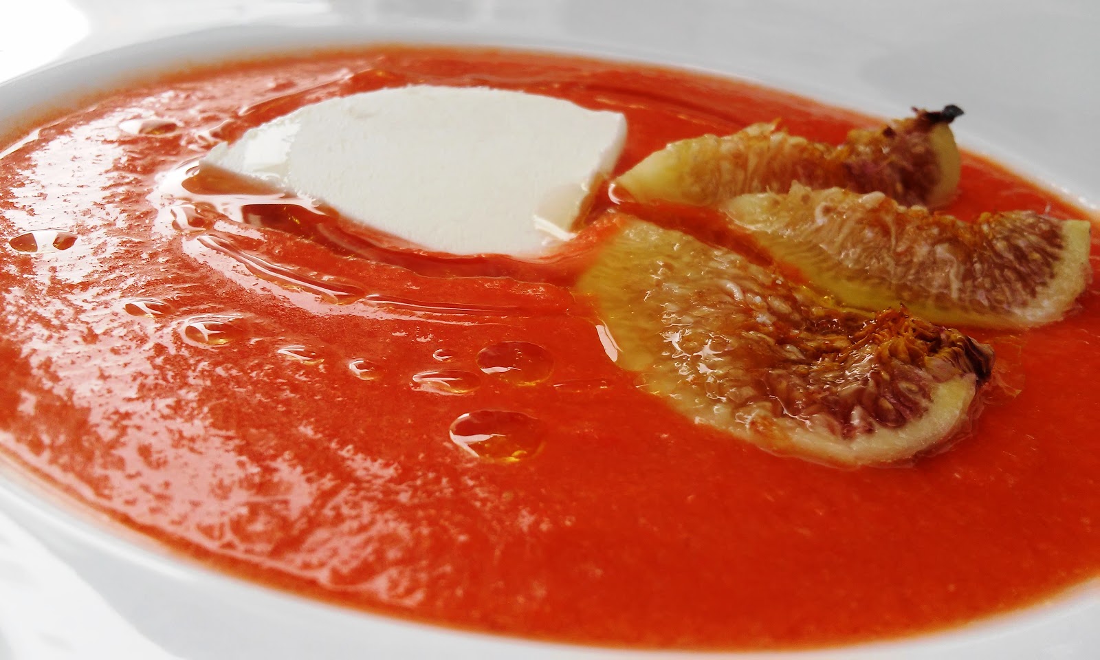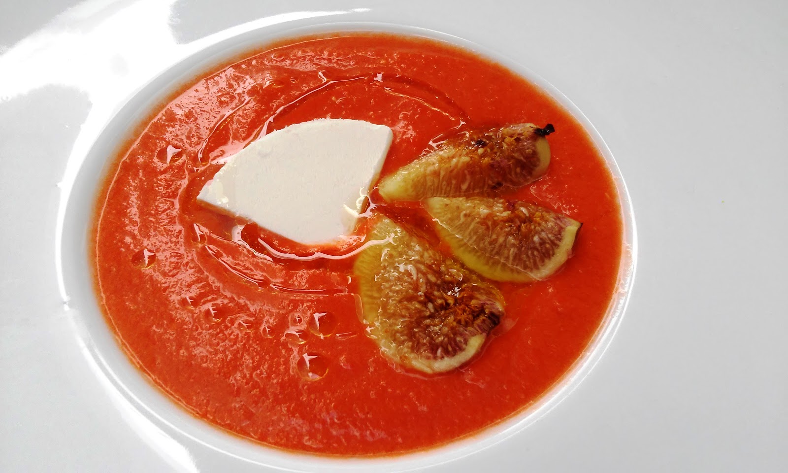 Pon en el vaso los tomates, pimientos, diente de ajo y pan troceado. Tritura con velocidad progresiva 5-10, durante 30 segundos. Añade el vinagre y sal. Cierra la tapadera y con el cubilete puesto ve echando en ella el aceite de oliva , poco a poco. Programa velocidad 6, durante 2 minutos. Sirve en cuencos o platos individuales con un trozo de rulo de queso de cabra y el higo sin piel y cortado en cuartos. Pon un hilo de aceite de oliva por encima.