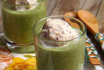El helado tenía claro que lo iba a hacer, pero la mostaza con el salmorejo tradicional, no me acababa de convencer, pero buscando y buscando vi el salmorejo verde, intenté ponerle ingredientes que fueran bien con la mostaza, y de verdad que las dos cosas juntas han resultado.