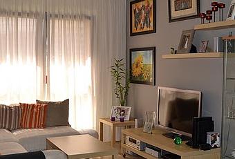 Bueno, pues este es nuestro salón. Se trata de un salón comedor de forma rectangular, siendo dividido por la mitad por la entrada al pasillo, por lo que la zona destinada a salón queda delimitada con muy poco espacio. Nuestra intención era preparar una estancia acogedora y destinada al descanso, pero sin que quedara recargada y tratando de aprovechar la luz natural.