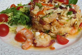 Trocear el pulpo cocido, los langostinos pelados encima del rape y los huevos en el cestillo