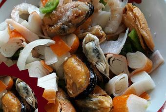 250 g de langostinos 250 g de mejillones 1 pimiento verde 1 tomate 3 barritas de surimi ½ cebolla Un chorrito de vinagre Un chorrito de aceite SalELABORACIÓN