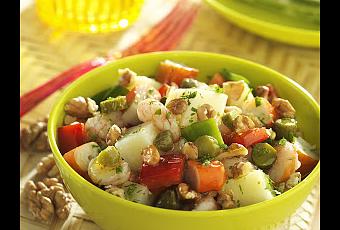 5 patatas medianas- 40 g de nueces de California -150 g de colitas de gamba cocidas -6 palitos de surimi -1 pimiento verde -1 pimiento rojo- 6 pepinillos en vinagre -1 cucharada de alcaparras -1 ramita de perejil -6 cucharadas de aceite de oliva -3 cucharadas de vinagre -Pimienta