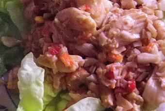 Ingredientescabezas de merluza8 palitos de cangrejo,6 langostinos2 huevos cocidosmedia cebolla2 pimientos morrones en latasal, pimienta, aceite de oliva virgen extra, vinagre de jerezPreparaciónCuando vamos a la pescadería a comprar merluza le pedimos al pescadero/a que nos de la cabeza merluza. Cuando tengo varias en el congelador, hago este plato.pongo a cocer las cabezas de merluza con las partes verdes de los puerros,(os aclaro que cuando uso puerros, solo utilizo la parte blanca, pero guardo estas partes verdes, para los caldos, porque aromatizan de maravilla, y aquí como sabéis no se tira nada).y unas ramitas de laurel.Cuando el caldo da un hervor, se ponen a cocer los langostinos.Se aparta del fuego, se retiran los langostinos, se pasan por el agua fría, se pelan y se reservan.Picamos muy fina la media cebolla, y el pimiento morrón, lo mezclamos, y reservamos.Cocemos los huevos los pelamos y cortamos en daditos pequeños y reservamos.Hacemos el aliño. una parte de vinagre por cuatro de aceite, sal y pimienta. Emulsionamos, y lo dejamos preparado para el salpicónLimpiamos las cabezas de merluza y reservamos la carnecortamos los palitos de cangrejo en trocitos, y montamos el plato.Juntamos todos los trocitos; la merluza, los langostinos, los palitos de cangrejo, el huevo, la cebolla y el pimiento, y lo mezclamos bien.Esto lo ponemos en el bol donde tenemos el aliño, y dejamos en la nevera por un rato hasta que sirvamos.En este caso yo lo serví en un plato adornado de lechuga y acompañado de salsa rosa.