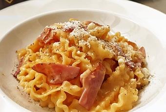 La receta de la salsa carbonara original tiene entre sus ingredientes los huevos, guanciale, el queso pecorino romano y parmesano y pimienta negra. Esta salsa se suele utilizar para pastas largas, los espaguetis carbonara son los más frecuentes, aunque también se puede utilizar fettuccine, rigatoni o mafaldine como los que hemos utilizado en esta receta.