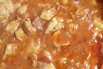 Cuando vemos quela verdura ya está bien rehogada y vemos que la cebolla no está cruda, echamos los cubos de pollo dentro de la cacerola, y mezclamos. Es importante que la cebolla quede totalmente rehodada, queno se le vea ni un pedacito crudo, porque puede estropearte la salsa, está quedará ácida.