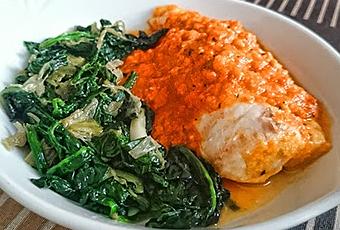 Unos 10 minutos antes de sacar la salsa, le añadiremos la albahaca fresca y rectificaremos de sal si fuera necesario. Aquí tenéis el resultado final, una increíble salsa de tomate casera con mero de río y guarnición de espinacas.