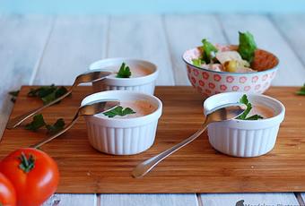 En mi caso he preparado una ensaladita de lechuga, patata cocida, bonito y unas aceitunitas a la que le he dado el toque del tomate mediante esta salsa que me ha servido igualmente para aliñarla.