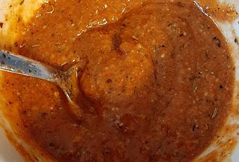 3 dientes de ajo (nosotros alioli) hierbas y especias al gusto (orégano, perejil, tomillo, comino, curry) 1 cucharadita de pimentón 3 cucharaditas de vinagre 1 cucharadita de eritritol