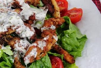 - Plato con lechuga troceada, tomates cherry cortados en dos y un poco de sal. Poner encima tiras de pollo adobadas (con zumo de limón, sal, pimienta y hierbas al gusto), empanadas con huevo y pan rallado, y fritas. Y por último salsa ranchera al gusto.