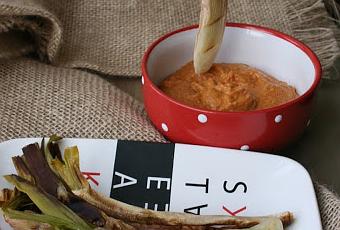 3.Solo te queda mojar en el romesco como si no hubiera mañana. 4.Ya sabes, inclinas la cabeza mirando al techo y metes el calçot en la boca,Yo no lo comí entero.Si raspas con los dientes, te encuentras la agradable sorpresa de un interior suave y dulce y las capas de afuera las deseché.