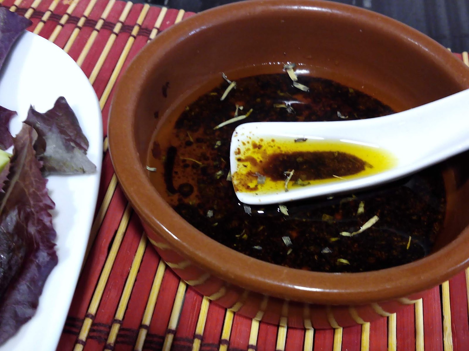Una parte de vinagre balsámico (Una cuchara sopera)Tres partes de aceite de oliva ( Tres cucharas soperas)orégano1 Diente de ajo laminadoPimienta negraPimentón dulcePimentón picanteSalNuez moscada
