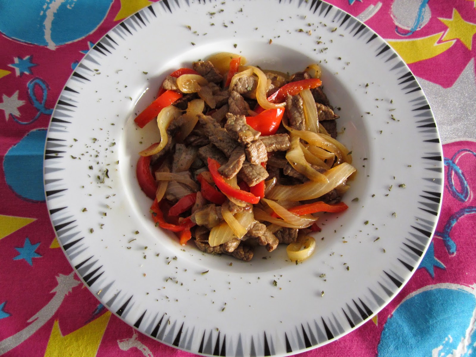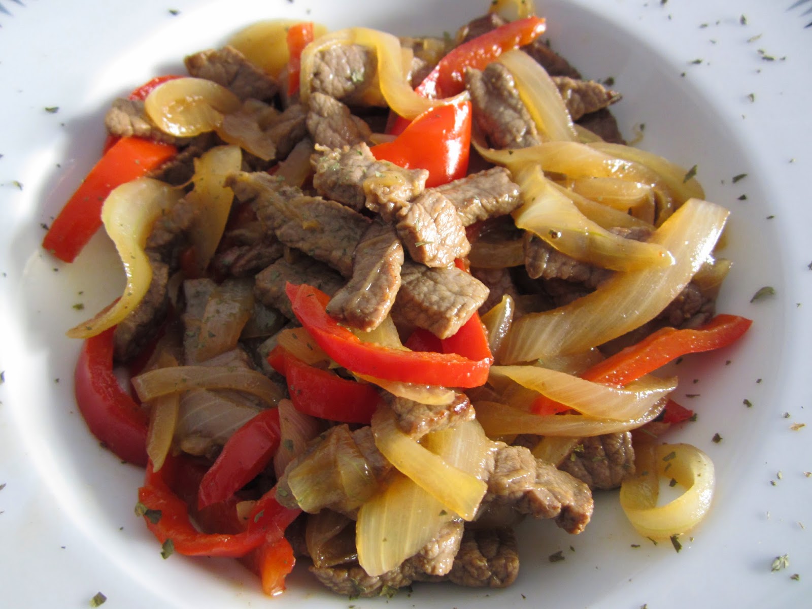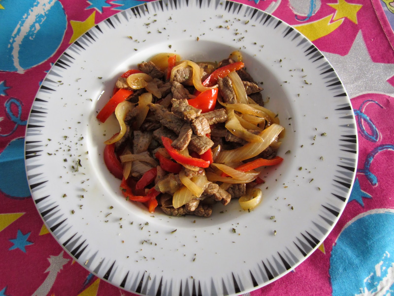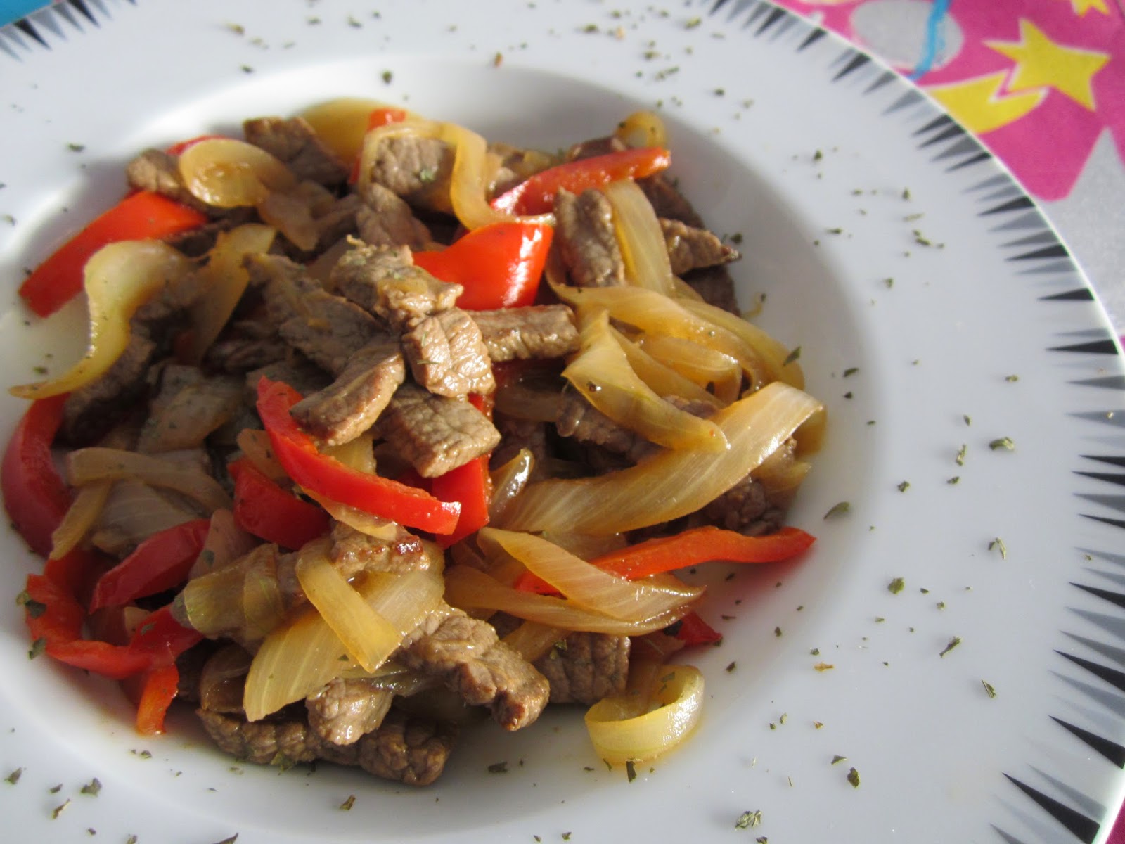 Una vez la ternera este sellada la retiramos a un plato.Salteamos en la misma sartén la cebolla cortada en medias lunas y el pimiento en tiras, a fuego medio hasta que quede hecho pero al dente, no muy blando...