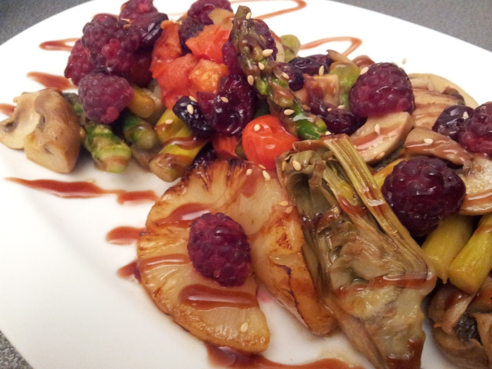 30 gr de Arándanos rojos deshidratados 30 gr de Frambuesas frescas 2 Alcachofas grandes 6 Espárragos trigueros 3 Champiñones Portobello 10 Tomates cherry ½ Naranja Sal Aceite de Oliva Elaboración paso a paso 1. Cortar alcachofas, champiñones y espárragos en cuartos, los tomates los cortaremos a la mitad y las frutas las dejaremos enteras. En un sartén, colocar un poco de aceite de oliva y dorar las alcachofas, cuando éstas hayan adquirido un color dorado, añadiremos los champiñones, y los espárragos, los dejaremos dorar a fuego fuerte al menos 3 minutos y finalmente añadir los tomates.