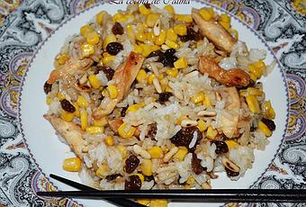 300 gr de arroz de grano largo250 gr de pechuga de pollo100 gr de pasas50 gr de piñones100 gr de maíz dulce4 cucharadas de salsa de soja4 cucharadas de aceite de oliva virgen extrasalPreparación:
