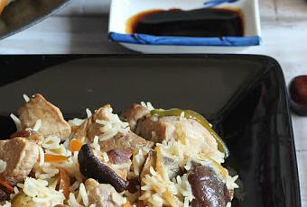 300 g de arroz Sundãri Thai Jazmine, 1 pimiento verde, 1 pimiento rojo, 1/2 cebolla morada, 2 zanahorias, 75 ml de aceite de oliva virgen extra, 25 ml de aceite de sésamo, un solomillo de cerdo (ibérico si es posible), 10-12 uvas pasas, 4 setas shiitake deshidratadas (o setas similares) 1 trocito de jengibre fresco, y salsa soja clara al gusto, 90 ml de salsa de soja, 1 cucharada de jengibre fresco picado, 1 cucharada de ajo picado.