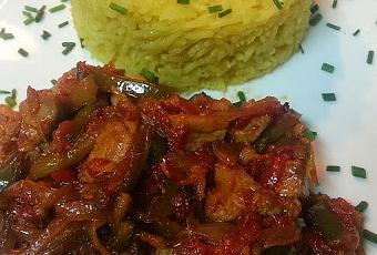 - Medio pimiento rojo - Medio pimiento verde (del mismo calibre) - Una cebolla tierna - 150 gramos de cordero (en taquitos) - Dos tazas de café de arroz bashmati - 50 gramos de jengibre fresco - 5 cl. de salsa de soja (preferiblemente baja en sal) - Aove - cúrcuma - curry - sal - cebollino (para adornar)
