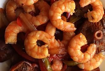 El plato de hoy, unos langostinos con verduras y setas aliñados con salsa Sukiyaki de Kikkoman que es especial para salteados. Un sabor... sensacional, delicioso, perfecto!!