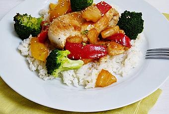 Cortar los pimientos en tiras. Una vez que el pollo está cocinado, añadir la mezcla de la piña y su jugo a la sartén y subir el fuego. Dejar que esta mezcla hierva durante aproximadamente cinco minutos. Añadir el brécol y los pimientos y mezclar. Cocinar todo bien hasta que los pimientos estén crujientes.