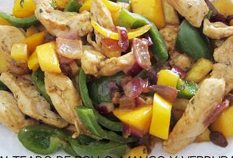 Receta rápida, de las que nos soluciona una comida completa usando ingredientes frescos y todos podemos tener en la nevera.Cogemos unas pechugas de pollo, las cortamos en tiras gruesas, cortamos pimiento rojo y amarillo, cebolla roja y tiras de mango.Lo vamos a saltear todo con un poco de aceite en un wok bien caliente, a fuego fuerte para que queden las verduras al dente.Picamos unas almendras en el mortero y mezclamos con dos cucharadas de salsa de soja y una cucharada de pasas.Se lo añadimos al wok y removemos durante un minutos más.Y ya tenemos un rico y sano plato en menos de 15 minutos preparado.