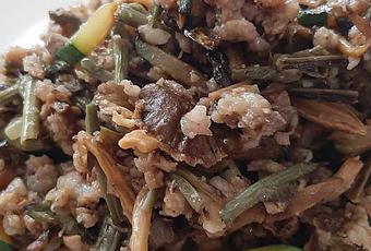 Haciendo limpieza del congelador han aparecido unas setas de las que cogimos el otoño pasado y había que liquidarlas ya, también espárragos cogidos en primavera, un calabacín que rondaba por la nevera y butifarra de perol.