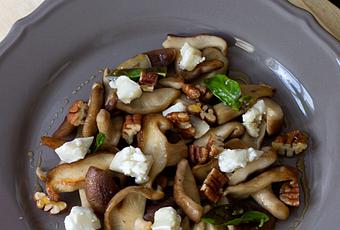 - Desmigamos el queso de cabra y lo ponemos por encima de las setas, junto con las nueces pecanas picadas.