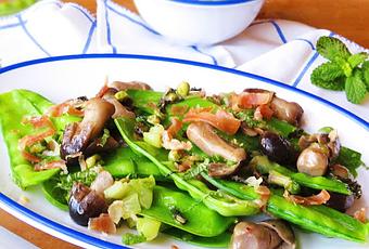 200 gr. de tirabeques tiernos½ cebolla tierna2 ajos tiernos70-80 gr. de setas en conserva1 loncha finade jamón ibérico2-4 hojas de mentaSal, pimienta negraAceite de oliva virgen extraLimpiar los tirabeques, quitar los hilos o hebras que tiene a ambos lados. Reservar.En una sartén con unas gotas de aceite poner la cebolla limpia cortada a dados pequeños, el ajo tierno lavado desprovisto de la primera capa y las raíces,cortado arodajas tirando a finas, un poco de sal y pochar unos 7-9 minutos aproximadamente.Incorporar las setas bien escurridas, rehogar un par de minutos.Agregar los tirabeques, y rehogarlos unos 3-5 minuto más, salpimentar.Añadir el jamón ibérico cortado a tiras finitas, así como la menta, a tiras finas también.Retirar del fuego y servir. Para quitar las hebras a los ** Las ** Puede ser congeladas, frescas,.. adaptar el tiempo de cocción según sean.