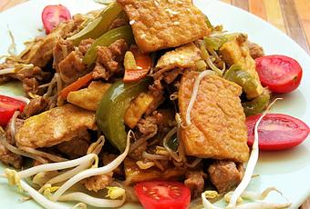 - Cut the tofu into medium pieces. Heat a splash of vegetable oil in a pan and fry tofu pieces until golden brown. Add chopped garlic cloves and cook stirring occasionally for 2 minutes, then add TVP chunks and stir fry for 5-7 minutes. Add soy bean sprouts, green bell pepper cut into strips, carrot cut into slices, soy sauce, sugar and white pepper. Cook for 5 minutes more and serve.