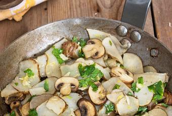 INGREDIENTES250g de alcachofa de Jerusalén 150g de champiñones portobello1 ajoUna cucharadita de piel de limon ralladaEl zumo de medio limónPerejilSalPimientaAOVE
