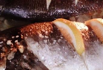8. Echamos un buen chorro de vino blanco por encima de las patatas, también un chorro de aceite de oliva (a poder ser virgen), y sal / Add a generous amount of white wine, virgin olive oil (if possible) and salt9. Metemos las patatas al horno a 180º / Put the tray on the oven at 180 degrees10. Cogemos las doradas, les hacemos 2 cortes y les ponemos una rodajita de limón / Do a couple of cuts of the gilt head bream and we insert lemon slices on them.11. Después de unos 10 minutos de cocción de las patatas, abrimos el horno para colocar encima las doradas.... / After 10 minutes, open the oven to include the gilt head bream