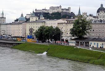 El viaje en tren de Viena a Salzburgo dura poco menos de tres horas. A media tarde llego a la estación de Salzburgo (tren i/v Viena-Salzburgo 103 €) y aunque el hotel que he reservado queda muy cerca me vuelvo loca buscándolo, no encuentro a quien preguntar y al rato aparece casi oculto tras un jardín privado.Me registro, compro allí mismo la tarjeta Salzburgo (36 €) que incluye entradas y autobuses (merece la pena ya que da acceso a los lugares más interesantes de Salzburgo), dejo las cosas en una habitación sencilla con terraza que da al jardín y salgo a conocer esta ciudad declarada Patrimonio Cultural de la Humanidad por la Unesco.