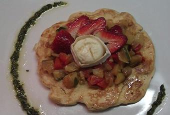 4. Sobre el plato ponemos la tortita, la pincelamos con miel diluida en un poco de agua caliente. Sacamos ración y se lo añadimos a la tortita. Cortamos las fresas en láminas, adornamos y pincelamos las fresas con miel. Para finalizar decoramos el plato con una cucharada de albahaca.