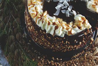 - Montaje. Coloca la base de bizcocho, rellena con la crema de queso, coco tostado y un poco de caramelo . Así hasta terminar con las tres capas. Cubrir con el ganache de chocolate, añadir el coco tostado y las almendras garrapiñadas y verter caramelo por encima la gusto.