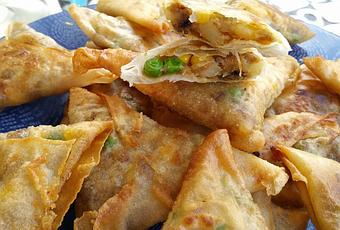 4. Freímos las samosas en aceite caliente colocando la parte con los pliegues hacia abajoprimero para que se selle la masa, cuando se dore damos la vuelta. Cuando las samosas estén listas eliminamos el exceso de aceite con el papel de cocina y servimos.