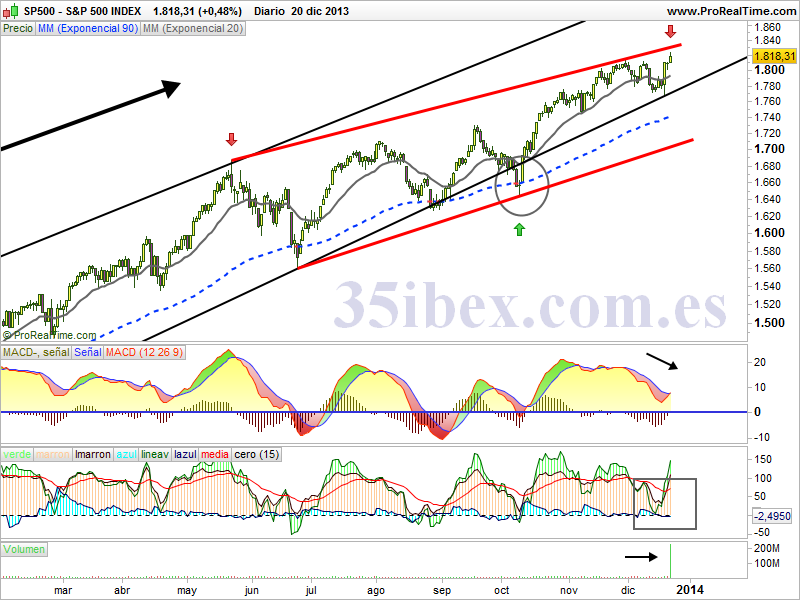 En estos gráficos la situación cambia bastante. Aún con la tendencia claramente alcista, los indicadores ya no están tan coordinados con la situación: están al límite.En el gráfico tengo dibujados dos canales alcistas. El primero es el de más largo plazo y que ya fue vulnerado una vez, dando origen a un segundo canal con una pendiente mucho menos alcista.El precio se encuentra justo en la parte alta del canal, con divergencias bajistasen el MACD, tanto en sus líneas como en el histograma, que en esta última subida, ha conseguido pasar de cero por los pelos.El volumen de la vela de ayer, es descomunalmente alto. En estos momentos dudo de si los datos que me muestra Prorealtime son correctos o no.Aún con todo este volumen “si lo damos por bueno”, la mano fuerte ayer no estuvo comprando….Cualquier analista técnico te diría que estamos en resistencia, y en resistencia no se compra. Yo esperaría a ver si se rompen resistencias para seguir siendo alcista, o por el contrario buscar un soporte. Ahora mismo creo que el SP 500 es terreno abonado para los cortos. (Por su puesto hablando en el corto plazo).http://feeds.feedburner.com/blogspot/dADkpn
