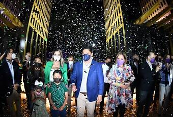 Posteriormente, las puertas del nuevo acceso principal se abrieron por primera ves, dejando que niños, niñas, jóvenes, madres y padres de familia siguieran al Gobernador por un camino iluminado, que los llevó hasta los alrededores del Lago Mayor, donde se pudo admirar un asombroso espectáculo de luces.