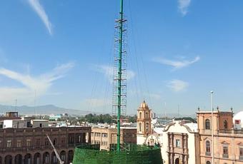 SLP.- Han iniciado las labores de montaje para coloca un árbol de navidad de 70 metros de alto en la Plaza de Los Fundadores, siendo el árbol con luces más grande de Latinoamérica.