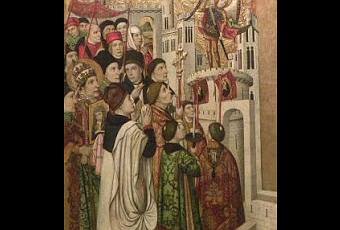 San Gregorio de Tours (17 de noviembre) cuenta que en 590 una terrible peste asolaba Roma y alrededores. El nuevo papa, San Gregorio Magno (12 de marzo y 3 de septiembre, elección papal) ordenó que para implorar misericordia a Dios, todos los clérigos, religiosas y seglares de Roma elevasen súplicas incesantes al Altísimo. Así, distribuyó a los fieles según las diaconías o distritos romanos: el papa, sus presbíteros y diáconos en la iglesia de Santos Cosme y Damián, los monjes en la iglesia de Santos Gervasio y Protasio, y las monjas en la basílica de Santos Marcelino y Pedro. Los niños fueron situados en la iglesia de los santos mártires Juan y Pablo, las viudas se congregaron en la iglesia de Santa Eufemia y los casados en la basílica de San Clemente. Cada grupo estaría acompañado por los presbíteros de cada distrito, que entonarían los salmos penitenciales. Así, turnándose y sin cesar, estos grupos orarían y harían ayuno durante tres días. Al cabo, todos irían en procesión penitencial hasta la Basílica de Santa María la Mayor, para implorar el auxilio de la Madre de Dios, tan efectivo siempre. Podéis imaginaros que impresionante liturgia sería esta. Pasaron los tres días, cuando el día 25 de abril, a las tres de la tarde, cada sección salió de su recinto llorando y demandando piedad a lo alto, cuando al tomar el puente sobre el río Tíber, se vio aparecer sobre el mausoleo de Adriano al ángel Miguel, con una espada de fuego en alto. El ángel, con gesto solemne, envainó la espada, dando a entender que la plaga cesaba por la súplica confiada del pueblo. El 29 de septiembre 610 el papa Bonifacio IV consagró definitivamente aquel sitio dedicándolo a San Miguel, llamándose desde entonces y hasta hoy "Castel Sant'Angelo". Ese día con el tiempo, sería la fiesta de San Miguel Arcángel. En el museo del Capitolio puede verse una piedra con una huella que, supuestamente, sería la del santo arcángel. Todo lo recoge, como dije, Gregorio Turolense, que dice haberlo escuchado de la misma boca de un diácono romano que estuvo allí presente en el milagro.