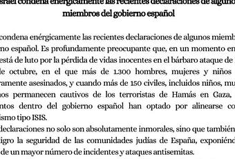 Israel acusa a los ministros comunistas de Sánchez de «alinearse» con el terrorismo de Hamás. La embajada de Israel en España emite un duro comunicado contra el Ejecutivo y exige a Sánchez que "condene inequívocamente las vergonzosas declaraciones" en favor del cruel terrorismo de Hamás de "elementos" de su Gobierno.