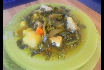 5.- Una vez que rompa el hervor añadimos las patatas, el pollo, las zanahorias, acelgas, judías verdes y el cilantro.