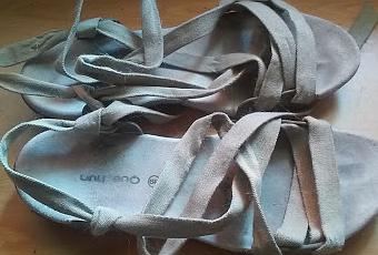 Lo demás es cuestión de ir trenzando y ajustando las tiras a tus piés. Los extremos del trapillo los he cosido a las otras tiras y los he camuflado. Como es una tela elástica puedes descalzarte sin problema y también evitas el estar anudándote todo el tiempo.