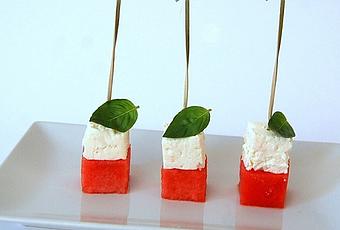 Lo que os traigo hoy es tan sencillo como lo veis. Cortar taquitos de sandía, sin pepitas, y ponerle encima otro de queso feta. Le pinchamos una brocheta y colocamos una hojita de albahaca fresca a cada uno y a disfrutar de este sencillo aperitivo.
