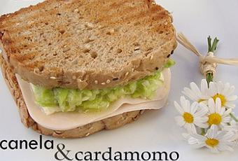 Una vez tostadas las rebanadas de pan las regaremos con un hilo de aceite de oliva. Sobre una de ellas colocaremos la loncha de queso y sobre este dos lonchas de pechuga de pavo. Cubriremos con la mezcla de calabacín. Finalmente cubriremos con otra rebanada de pan tostado impregnado con un chorrito de aceite. Listo para merendar y para el partido.
