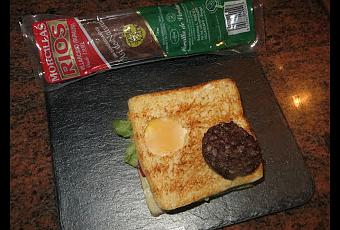 Elaboración:Untamos las rebanadas de pan de molde de mantequilla y las ponemos en una plancha para que se nos vayan tostando, esto es opcional si queréis hacer un plato más ligero no hace falta. Echamos un poco de aceite en la sartén para dorar la morcilla, que tenemos cortada en rodajas, ni muy gordas porque no estaría bien para el sándwich, ni muy finas porque se nos romperían en la sartén. La doramos por ambos lados y en otra sartén freímos el huevo.