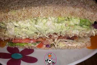 Ponemos en una rebanada de pan de molde un poco de mayonesa, ponemos la lechuga picadita y el tomate en rodajas. Ponemos otra rebanada de pan de molde y ponemos lo que teniamos en el bol, tapamos con otra rebanada del pan y listo para comer.